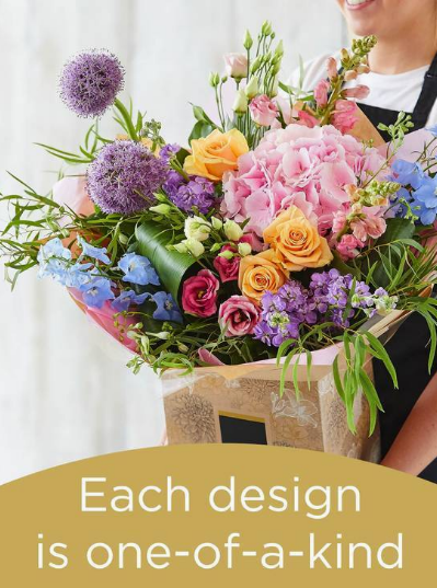 Each and every design is one-of-a-kind, created by an artisan florist using the freshest stems available on the day so, whilst your gift will look different to the one pictured, it’ll still be just as lovely