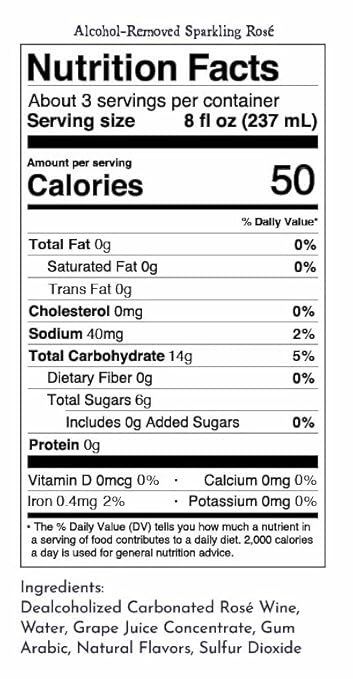 Dealcoholized Carbonated Rose Wine, Water, Grape Juice Concentrate, Gum Arabic, Natural Flavors, Sulfur Dioxide.